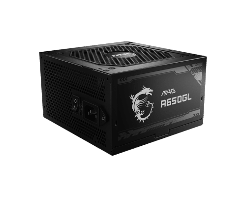 MSI MAG A650GL. Potencia total: 650 W, Voltaje de entrada AC: 100 – 240 V, Corriente máxima de entrada (@110V): 10 A. Alimentador de energía para tarjeta madre: 20+4 pin ATX, Tipo de cableado: Totalmente modular. Utilizar con: PC, Factor de forma de fuente de alimentación (PSU): ATX, Certificación 80 PLUS: 80 PLUS Bronze. Color del producto: Negro, Tipo de enfriamiento: Activo, Diámetro de ventilador: 12 cm. Ancho: 150 mm, Profundidad: 140 mm, Altura: 86 mm